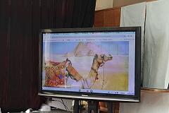 5年生の国語の教室。子どもたちがじっと大型モニターを見つめています。映し出されているのは、広大な砂漠に佇むラクダと、背後にそびえ立つピラミッド。今日は、この風景を絵ではなく『「言葉」でスケッチ』する学習です。