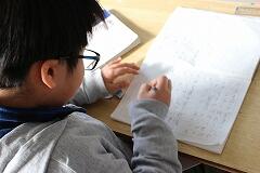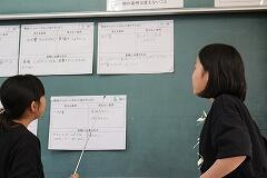 タブレットで集まったクラス全員の意見を参考にしつつ、班の最終回答を大きなシートに書き込んでいきます。仲間の意見を聞き、自分の考えをブラッシュアップさせる姿は、まさに「協働的な学び」そのものでした。