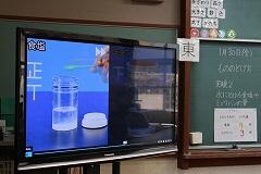 まずは前時の振り返りからスタート。50mlの水に「食塩」と「ミョウバン」がそれぞれどのくらい溶けるのか、実験動画で再確認しました。黒板には、前回の結果が示されています。