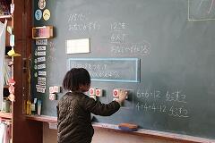 次は、4人のお友達におなじかずずつ分けるにはどうするのか考えました。黒板の前では、代表の児童が大きなブロックを使って自分の考えを発表してくれました。 「まず1こずつ配って、次にまた1こずつ配って…」と、操作しながら説明する姿はとても頼もしく、クラスの仲間も「なるほど!」と納得の表情で聞き入っていました。