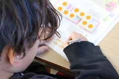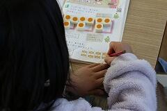 学習の後半では、少し違うパターンの問題にも挑戦しました。 「あめが8個あります。一人に2個ずつ分けると、何人に分けられますか?」という問題です。今度は、あめを「2個ずつの束」にして囲んでいきます。 「2個、4個、6個、8個…」と数えながら、「あ、4人に配れるね!」と、配れる人数を導き出すことができました。