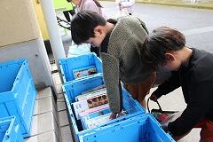 バスの外にも、本日返却されたばかりの人気の本が詰まった「あおいケース」が並びます。しゃがみ込んで真剣に選ぶ姿は、まるで宝探しをしているかのよう。外の空気を感じながら選ぶ本も、また格別です。