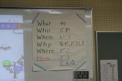 授業の前半は、デジタル学習プラットフォーム「GIMKIT」を活用した疑問詞(5W1H)の復習です。 ホワイトボードに掲示された "What / Who / When / Why / Where / How" の意味を、ゲームを通して定着させていきます。