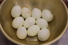 まずはゆで卵の殻むきからスタート。 「つるんとむけたよ。」、「あ、ちょっと白身がくっついちゃった…難しい。」と、指先に全神経を集中させて取り組みました。
