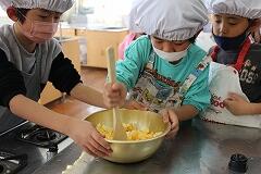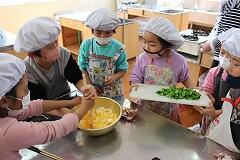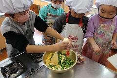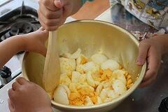 ボウルの中に、刻んだブロッコリー、細かくしたゆで卵、そしてハムを入れて混ぜ合わせます。「緑と黄色で、とってもきれい。」、「お花の畑みたいだね。」大きな木べらを交代で持ち、みんなで協力して「おいしくなあれ。」と願いを込めて混ぜ合わせました。