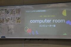 授業の前半は、学校の中にあるたくさんの「教室」の名前を英語で知るところからスタートです。ホワイトボードに映し出されたのは、「computer room(コンピュータ室)」や「music room(音楽室)」といったおなじみの場所。子どもたちは、ALTの先生のネイティブな発音をよく聴き、その後に続いて元気よくリピートしていました。