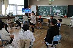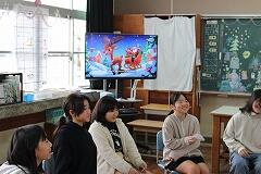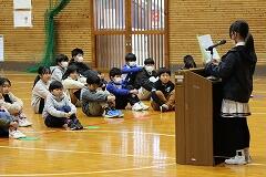 その後は、女の子による読み聞かせタイム。 ただ物語を読むだけでなく、「『そり』は英語で何て言うかな?」とクイズを出す場面も。 「スレー(sleigh)!」と元気よく発音を真似する様子に、日頃の外国語活動の成果がキラリと光っていました。
