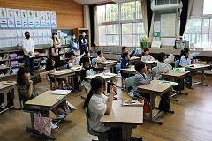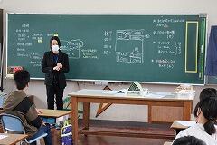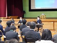 初任の原田養護教諭が、今年度の初期研のまとめとして研究授業を行いました。3年生の学級活動「よい姿勢と健康な体」を担任の先生とTTで行った授業でした。原田先生は、姿勢と体について専門的な視点から説明をしたり考えを促したりしていました。よい姿勢の練習の場面では、学習用端末を使い立腰の様子を写真で映して見せ合うなどの効果的な活用も見られました。授業の最後の子どもたちの立腰の姿勢は、とても美しい姿勢でした。
