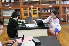 6年生は、植物の葉に日光が当たると養分(でんぷん)ができることを実験で調べていました。今日は、日光が当たっていない植物の葉にでんぷんがあるかどうかを実験の手順を確認しながら確かめていました。各班ごと植物の葉を慎重にお湯 につけ、ろ紙に挟んででんぷんをたたき出していました。ヨウ素液を垂らすと予想通り反応がなかったのを見て、やっぱりできないんだと納得していました。雨が続く中ですが、次の時間は日光が当たった葉を使って実験を行います。