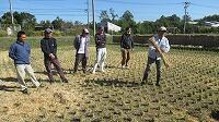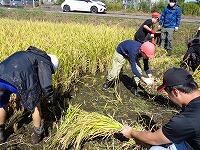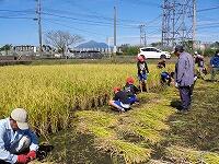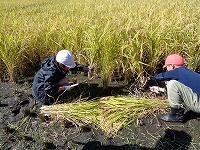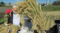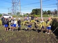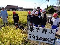 5年生が、JA庄内、JA庄内青年部、そよ風グループのみなさんと稲刈りを行いました。前日までの雨で、田の土がやわらかく動きにくかったのですが子どもたちはよくがんばりました。最初はぎこちなかった鎌の使い方も上達し、楽しく稲刈りができました。次は、足踏み脱穀機などの体験です。12月には、お世話になった方々を招待して感謝の会を開きます。