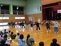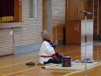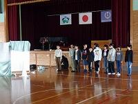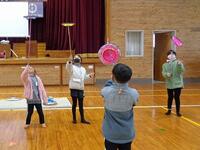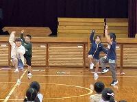 代表児童、3年、段日馬さんによる「3学期にがんばりたいこと」の発表に続いて大谷翔平選手寄贈のグローブとメッセージの紹介と皿回し愛好会「花さか爺一座」による皿回しの披露と体験を行いました。
