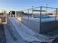 プール改修工事の進捗状況をお知らせします。プールの入り口がスロープになっています。大プールと小プールの間にロンブルが設置されました。