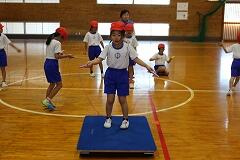 新しく登場したこの補助板に、1年生の子どもたちは興味津々。早速、体育の「なわとび学習」で活用することにしました。