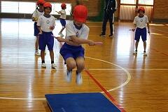 【「魔法の板」で大ジャンプ!空飛ぶ1年生】 ジャンピングボードは、板のしなりを利用して高く飛び上がることができる、いわば「なわとびの特訓ボード」です。