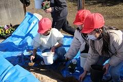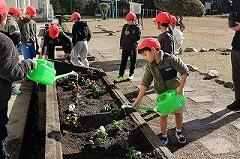 【学級園にも広がる「やさしさ」の輪】 一人一鉢の作業が終わった後は、残った苗をみんなで学級園に植えました。殺風景だった冬の花壇が、あっという間に華やかに変身!最後にジョウロで水をあげながら、「冷たくないかな?」、「たくさんお水を飲んでね」と声をかける姿に、子どもたちの心の成長を感じました。