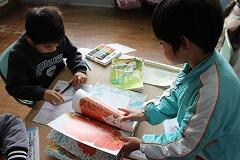 ◆牛乳がクリームに! 図書の本で「変身」の様子を発見。「見て見て、クリームになるんだって!」と、新しい発見を友だちと共有していました。