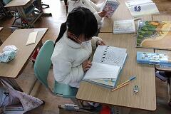 1年生の教室を覗くと、子どもたちが一冊一冊の絵本とじっくり向き合っていました。現在、国語の授業では「むかしばなしをよもう」という単元を学習しています。外国の昔話に親しみ、そこで感じたことを友達と共有しながら、読書の幅を広げていく学習です。