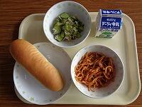 コッペパン、なすとウインナーのスパゲティ、青豆のサラダ、牛乳