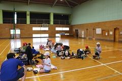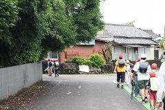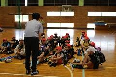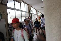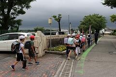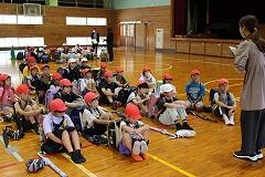避難指示が出されると、登校班長が1年生の教室へ迎えに行き、各地区の班ごとに整列。子どもたちは、先生の指示に従い、落ち着いて体育館へ移動しました。 体育館では、全校児童の人数確認後、担当教員から集団下校時の心構えや注意点について全体指導を行いました。さらに、各地区の担当教員が児童と共に、それぞれの通学路に潜む危険箇所(増水しやすい場所、冠水しやすい道路など)を確認し、安全意識を高めました。その後、教職員引率のもと、地区ごとに集団下校を開始しました。実際に下校しながら、特に注意が必要な場所や、大雨の際に水が溢れやすい箇所などを具体的に確認することができ、実践的な訓練となりました。
