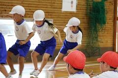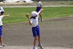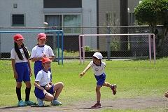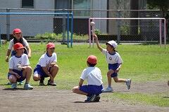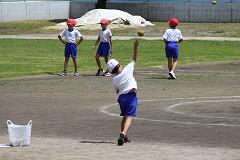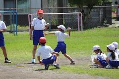 校庭で行われた「ソフトボール投げ」では、まず5年生がお手本を見せながら、投げ方のコツを優しく伝えます。「もっと肘を上げてごらん」「遠くを見て投げるといいよ!」。投げ終わった2年生が「どうだった?」と不安げに振り返ると、ボールをキャッチした5年生が「上手!その調子!」と笑顔でボールを返します。心強いアドバイスと励ましに、2年生は安心して、のびのびと腕を振っていました。