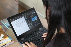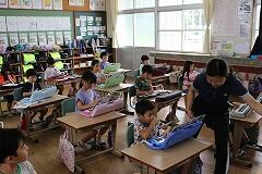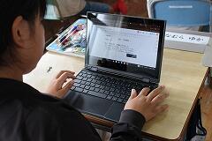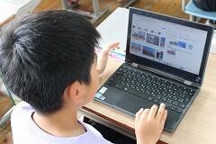 5年生の教室が、まるで新聞社の編集室のような熱気に包まれています。席に座ってキーボードを打つ子、友達と画面をのぞき込みながら相談する子、そして自分の考えを伝えるために立ち上がって話し合う子…。一人ひとりの手元にはタブレット端末があり、社会科の「暖かい地域のくらし」の学習のまとめとして、オリジナルの「沖縄新聞」の作成が活発に進められています。