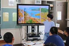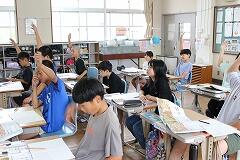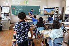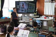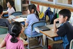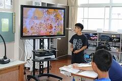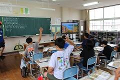 さらに、使っていた道具(もり、おの、土器なと)や、人々の間にあまり貧富の差がなかった社会の様子など、鋭い視点で次々と気付きを見つけ出します。モニターの絵を指さしながら友達に説明したり、隣の席の子と「これは何だろう?」と相談したり、自信をもって「はい。」と手を挙げたり。子どもたち一人ひとりが主体的に考え、意欲的に学ぶ姿がたくさん見られました。
