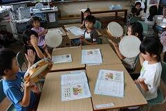 1年生の音楽室からは、いつも元気で楽しそうな音が聞こえてきます。 この日の授業は「はくにのってリズムをうとう」。みんなが大好きな歌「かたつむり」を使って、リズムに親しむ活動をしました。