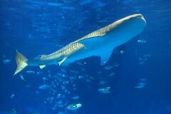 最初の見学地は、桜島 有村溶岩展望所にて笠をかぶった桜島の前で記念写真を撮りました。ごつごつした溶岩やライオンの形をした溶岩、遊歩道を歩くと靴にまとわりつく火山灰、突然噴火したときの避難壕などを見学しました。また、桜島の反対側には、今日の宿泊地のそばにある開聞岳(薩摩富士)がきれいなシルエットを見せていました。子どもたちも富士山のような山の姿に感激していました。今でも活発に活動している桜島の息づかいを感じながら、カーフェリーに乗船し次の見学地「かごしま水族館(いおワールド)」へ向かいました。