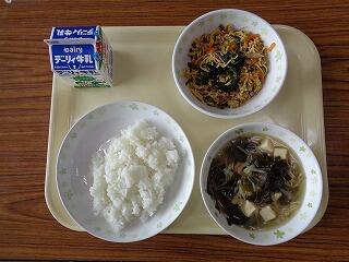 今日のメニューは、ごはん・さんさいいりビビンバ・わかめスープ・牛乳でした。昨日に引き続き、韓国風メニューでした。