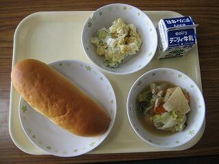 本日のメニューは、チーズパン、牛乳、ポトフ、いもいもサラダでした。