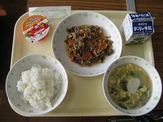 本日のメニューは、ご飯、牛乳、根菜の味噌煮、切干し大根炒めでした。