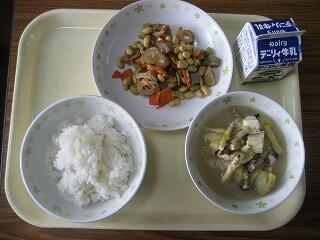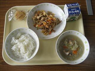 本日のメニューは、ご飯、牛乳、五目キンピラ、石狩汁、ねったぼでした。