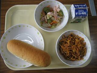 本日のメニューは、減量コッペパン、牛乳、きのこスパゲティ、りっちゃんサラダでした。