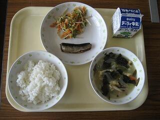 本日のメニューは、ご飯、牛乳、イワシの甘露煮、もやしのごま和え、小松菜のみそ汁でした。
