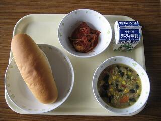 今日のメニューは、コッペパン、かぼちゃ挽肉フライ、クリームポタージュ、野菜サラダ、牛乳でした。かぼちゃと挽肉の組み合わせのフライは、かぼちゃの甘さがしっかり残っていました。