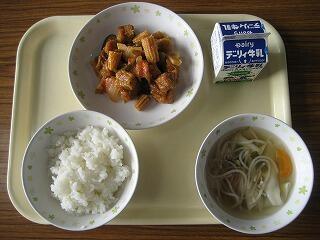 本日のメニューは、ご飯、牛乳、炒り豆腐、キムチ汁でした。