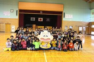また、都城PRキャラクター「ぼんちくん」が菓子野小学校に来てくれて、子どもたちと一緒にラジオ体操や妖怪ウォッチを踊りました。この交流には、地域の方々も参加してくださいました。子どもたちも嬉しそうでした。