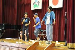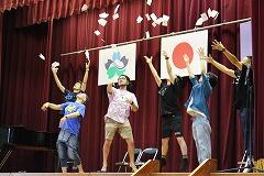 次の時間は、全校に児童による鑑賞教室になりました。事前に子どもたちに書いてもらった紙をステージに広げて、即興劇の途中で拾って読み上げる活動です。場面設定を子どもたちからインタビューで取り上げ『ブラジル、野球、サッカー、友達の家』を即興で演じていきました。また、児童が書いた紙を拾い、その言葉を読み上げると絶妙にぴったりとストーリーにあった場合は拍手や感嘆の声が湧き上がりました。逆の場面では、笑いも沸き起こりました。自分の書いた言葉が読み上げられて役者のセリフになったときに、自分のセリフだとわかるとニコニコしていました。今日の鑑賞教室は、言葉を大切にしてコミュニケーションの楽しさを体感するものでした。『ロクディム』のみなさん、楽しいひとときをありがとうございました。