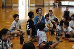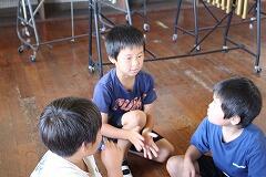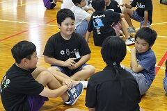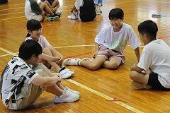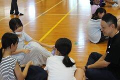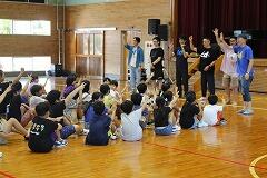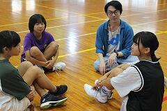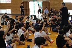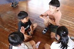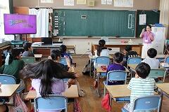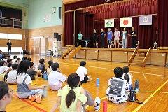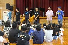 都城市文化振興財団 小学校アウトリーチ事業により、演劇団名『ロクディム』さんによる即興講演が行われました。まず、4~6年生を対象に演劇の手法を用いたワークショップを1時間行いました。ロクディムさんの上手なアドバイスにより児童は、4人グループによる連想ゲームや2人組による即興劇の活動を通して、笑顔が増えたり、声が大きくなったりと友達とのコミュニケーションの楽しさを感じていました。