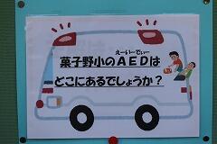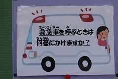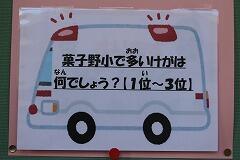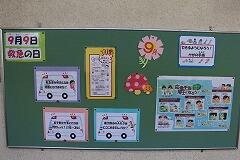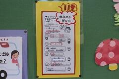 9月9日(月)は、『救急の日』でした。保健室前の掲示板では、救急の日に関する掲示物がありました。「菓子野小で多いけがは何でしょう?」、「AEDは菓子野小のどこにあるでしょう?」のようにクイズ形式で保健・安全にについて紹介をしていました。通りかかった児童は、めくって答え合わせをしていました。また、大切な命を守るための119番での電話のやりとりについて詳しく掲示してありました。