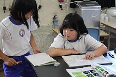 3年生理科の学習では、昆虫の成長の様子について教科書やタブレットの画像を見ながら、身体の変化の特徴をまとめていました。特に、さなぎになる場所(土の中、木や枝の上)のちがいについてもみんなに発表していました。その後、昆虫の足が身体のどの部分から出ているのかノートに絵で表して確かめていました。