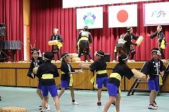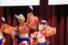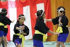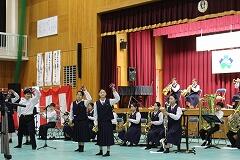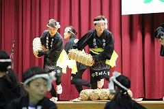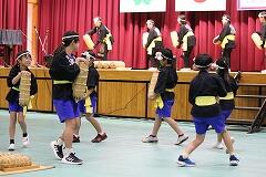 次に披露されたのは、菓子野小校区の千草地区に伝わる伝統芸能『千草奴踊り』です。華やかで可愛らしい着物に身を包んだ子どもたちは、この日のために2週間に1回の公民館での練習を積み重ねてきました。地元の方々による生演奏のもと、凛とした表情で、上体を起こしたまま手足を使い踊る奴踊りの特徴をしっかりと表現し、伝統の舞を披露してくれました。