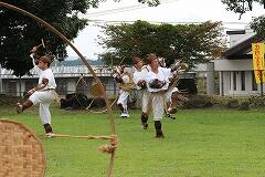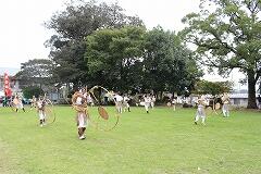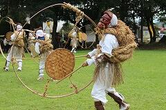 最後に、会場の外、体育館前の芝生では、都城市の指定無形民俗文化財である『熊襲踊り』が披露されました。鬼のような面をつけ、わらの衣装をまとい、竹編みの大きな輪(バラ)を操りながら、野性的かつユーモラスに舞う姿は圧巻です。鐘の響きに合わせ、大地を踏みしめて踊るその姿に、観客も引き込まれていました。