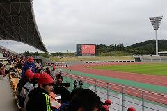 【午後は国スポPRダンスで一体感!】午後は、宮崎国スポPR動画撮影のためのダンスが行われ、スタンドを埋め尽くしていた1600人の6年生が一体となって緑一面のフィールドで踊りました。走ること、踊ること、そして仲間と楽しむこと。未来のメイン会場で、たくさんの思い出を作った一日となりました。