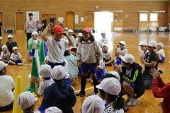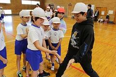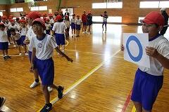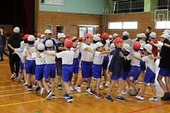 【2全校が一つに、長〜いジャンケン列車】 次に全校児童が楽しんだのは「ジャンケン列車」です。最初はお互いにジャンケンをして負けた人が勝った人の後ろにつながり、どんどん長い列車を作っていきます。「わーい。また勝った!どんどん長くなるよ!」ジャンケンが進み、体育館には長蛇の列車がいくつも誕生しました。そして、いよいよ最後の2チームでの対決!最終戦は、なんと6年生が先頭の列車が勝利しました。「やったー!最後のジャンケン、緊張したー。」全校児童が一つにつながり、体育館全体が一つの大きな、長~い列車になりました。