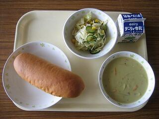 今日のメニューは、コッペパン、牛乳、グリーンポタージュ、さわやかサラダでした。