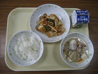 本日のメニューは、ご飯、牛乳、豚汁、タケノコの辛味炒めです。