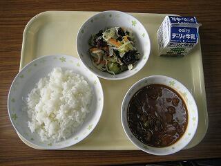 本日のメニューは、ご飯、牛乳、ハヤシライス、海藻サラダでした。