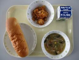 本日のメニューは、ご飯、牛乳、鶏肉の磯部から揚げ、きんぴらごぼう、けんちん汁でした。