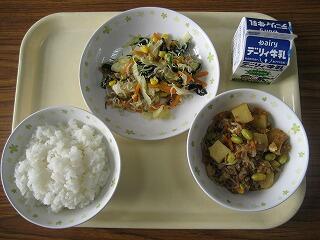 本日のメニューは、ご飯、牛乳、新じゃがいものそぼろ煮、ちりめんサラダでした。